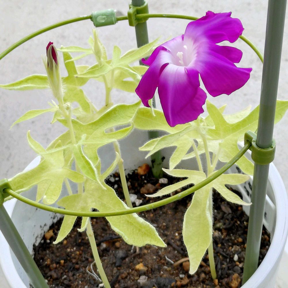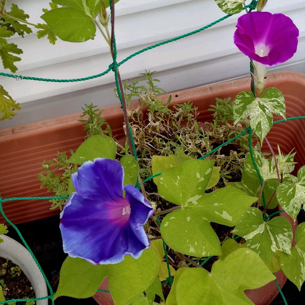 ①今日のアサガオ 昨年咲いたいろんな種類のアサガオのタネをわけずに蒔いたので葉っぱの形もいろいろで面白い🌱のですが欲張ってしまったかな😅 蔓が難しそうな気配