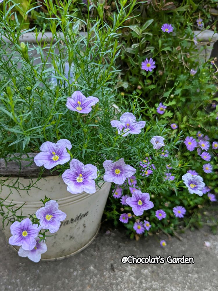 ブラキカムは冬の寄せ植えを春に処分セールで購入してからずっと咲いています。