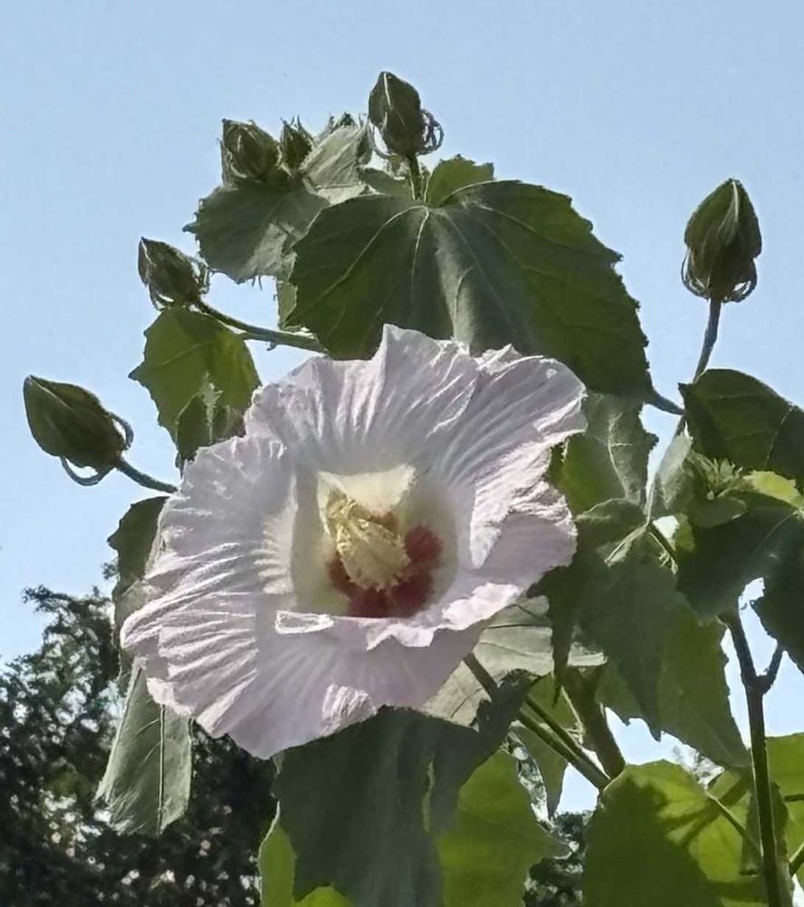 初開花╰(*´︶`*)╯♡。朝は忙しくて真っ白な芙蓉が撮れず昼になったらすでに色づいてました。