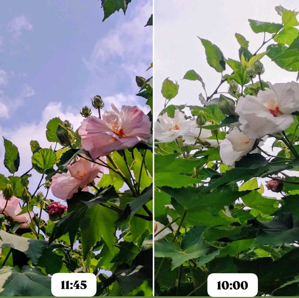 1枚めは、まだ白い花を咲かせる10時と、ピンクに染まった11:45の酔芙蓉。