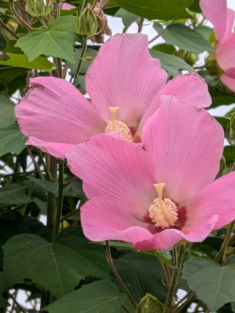 ムクゲは小さめでギザギザの葉と、まっすぐ伸びた雌しべを持つみたいね