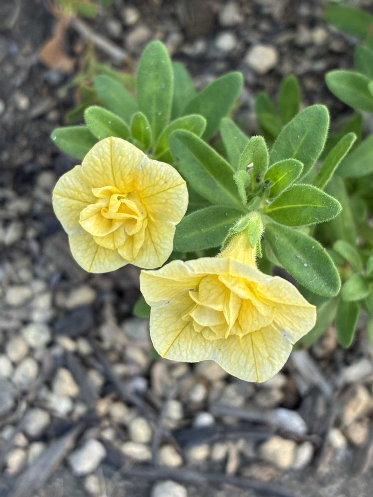 ペチュニア、八重咲きカリブラコア、白花宿根フロックス、ミニバラが元気に咲いています。