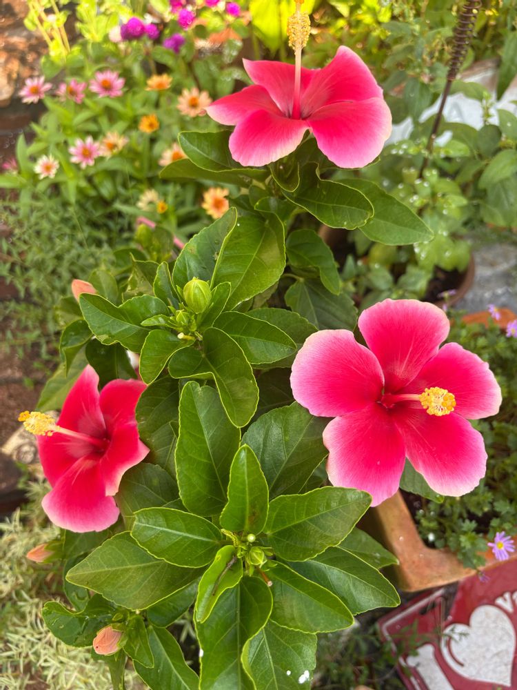 コンパクトなハイビスカスさん🌺が、鮮やかな色だね🌿