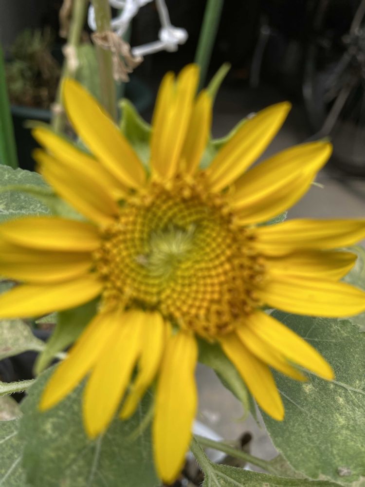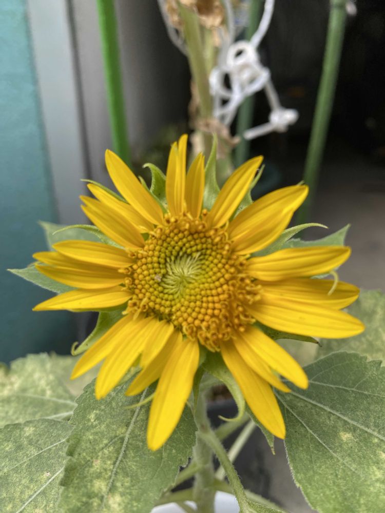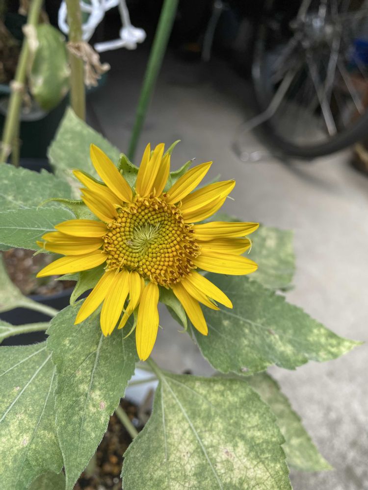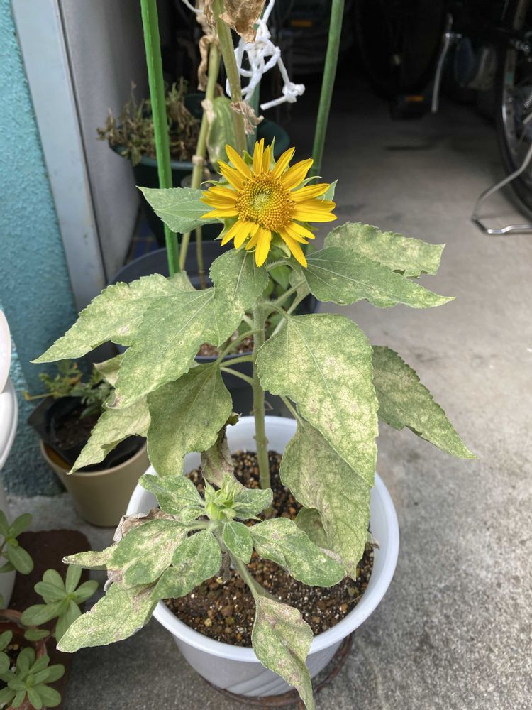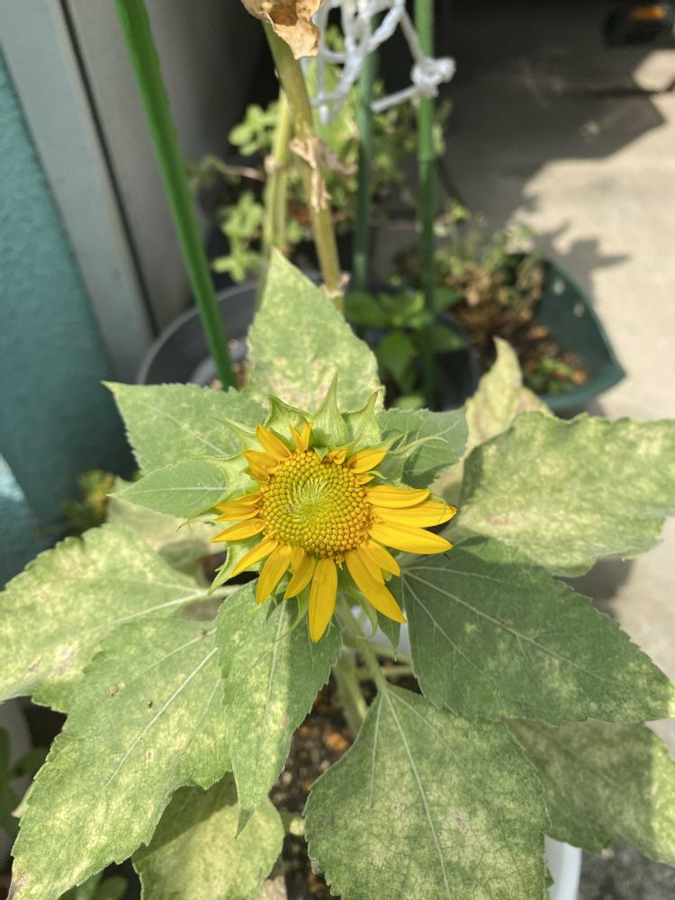 ダイソーさんの種からミニひまわり🌻咲いたよ〜😄葉はぼろぼろだけど、きれいに咲いたね❤️