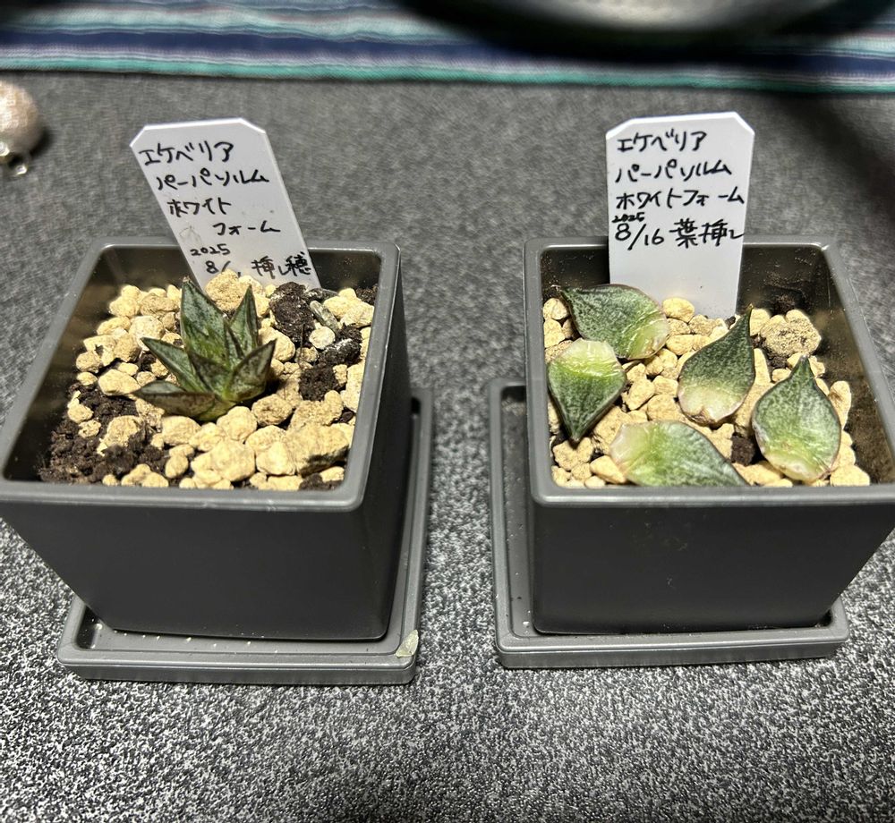 先日、挿し穂と葉挿しにしたエケベリア・パーパソルム・ホワイトフォーム。挿し穂の状態があまり良くなかったので…葉をいくつか落として、葉挿しの方に並べ、穂の方も様子見することにしました。
