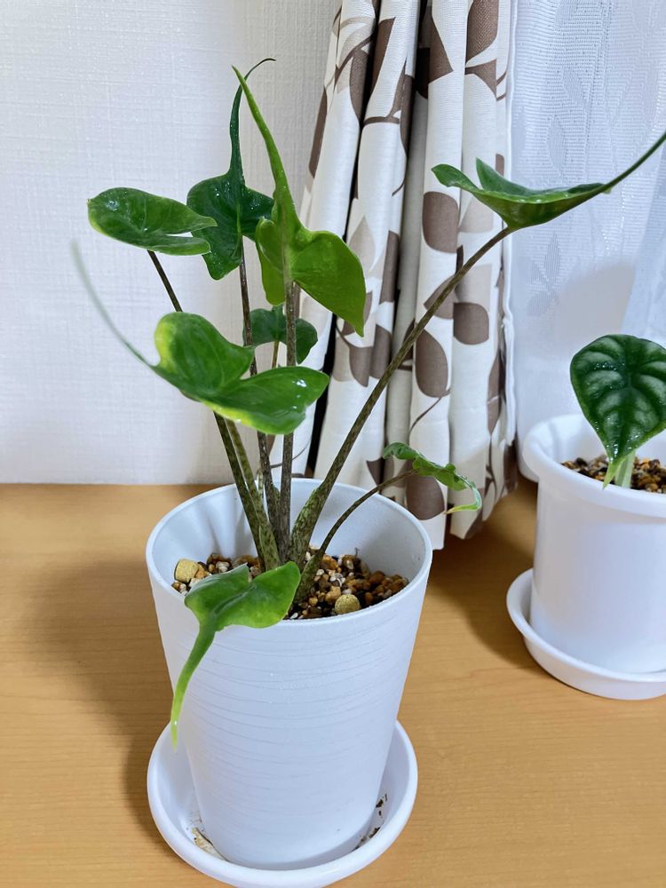 独特な葉の形に惹かれて購入。アロカシア•スティングレイの矮性品種。
