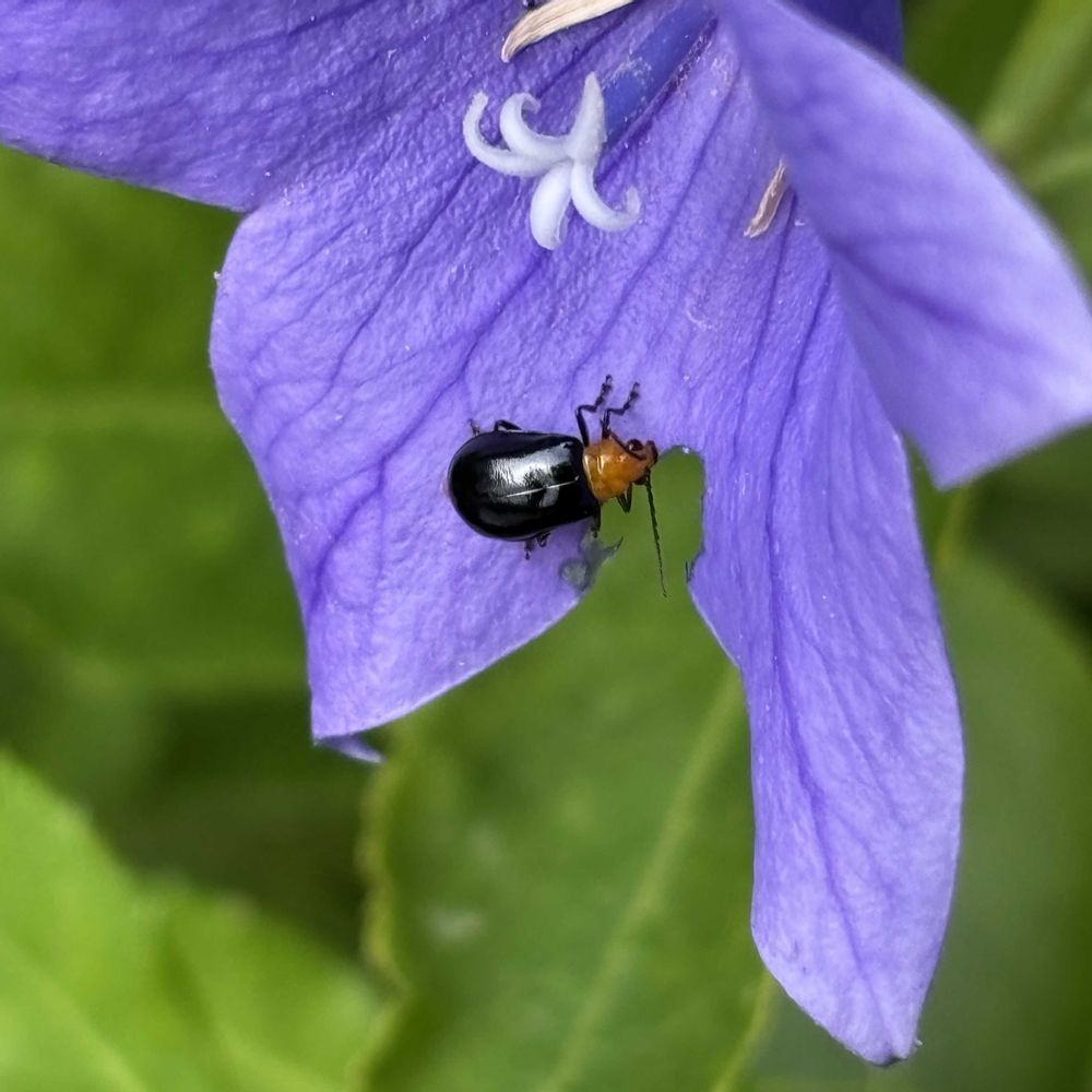 桔梗の花びらを食べる悪い虫、クロウリハムシ