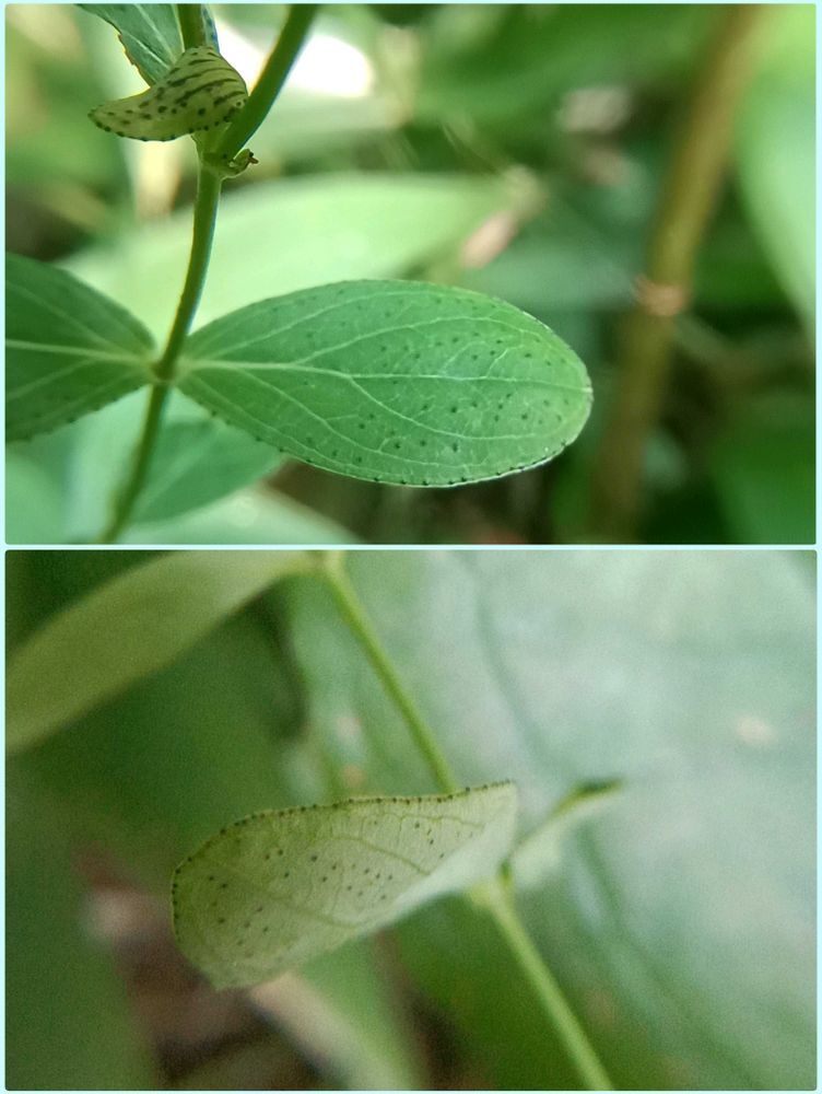 オトギリソウは日当たりの良い山地や丘陵地に生える多年草で、高さは40~60 cmになり、葉は対生し、広披針(こうひしん)形で、裏面から透かして見ると、黒い油点(黒点)が多数観察できます。7~8月頃、茎頂の円錐状花序に淡黄色の花を多数つけます。