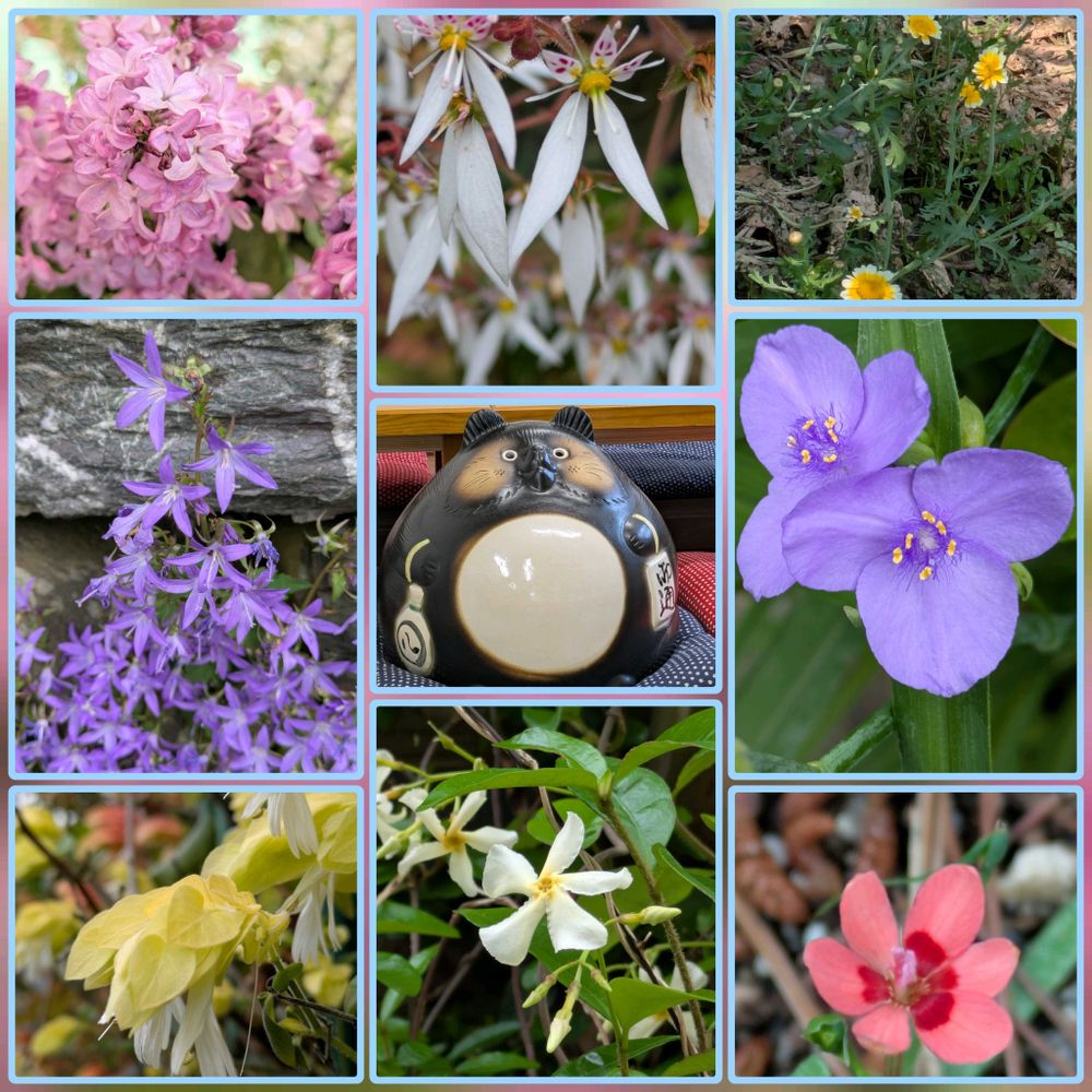 中央上より下へ:ユキノシタ・大きな大きな恰幅の良いたぬきの置物🤣🤣・テイカカズラ