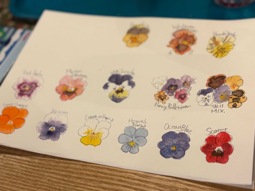 ビオラは少しずつ成長している。切り戻したペチュニアは勢いを増してきた。ふと、今年蒔いたビオラたちを描きたくなり水彩画を描いてみる。