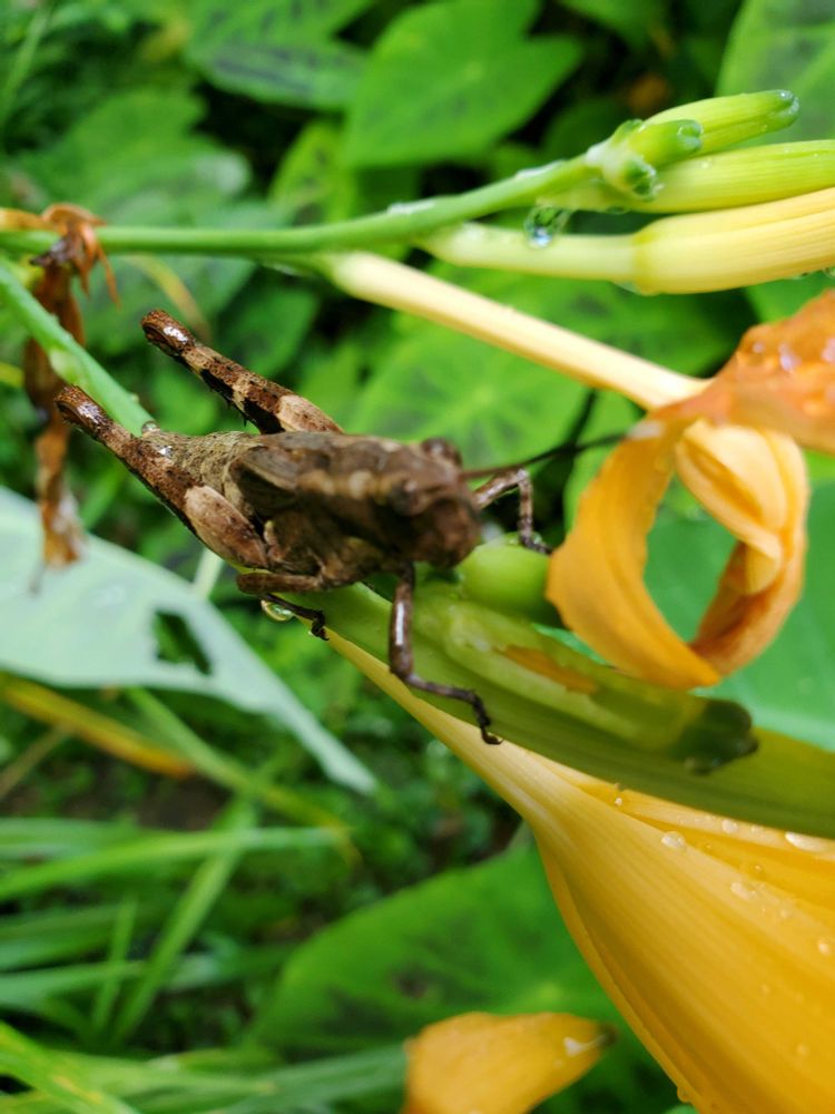 満開💠バッタも蝶も大好きなワスレグサ。可哀想ですが時々アゲハチョウが頭を突っ込んだまま窒息していることがあります。ナム