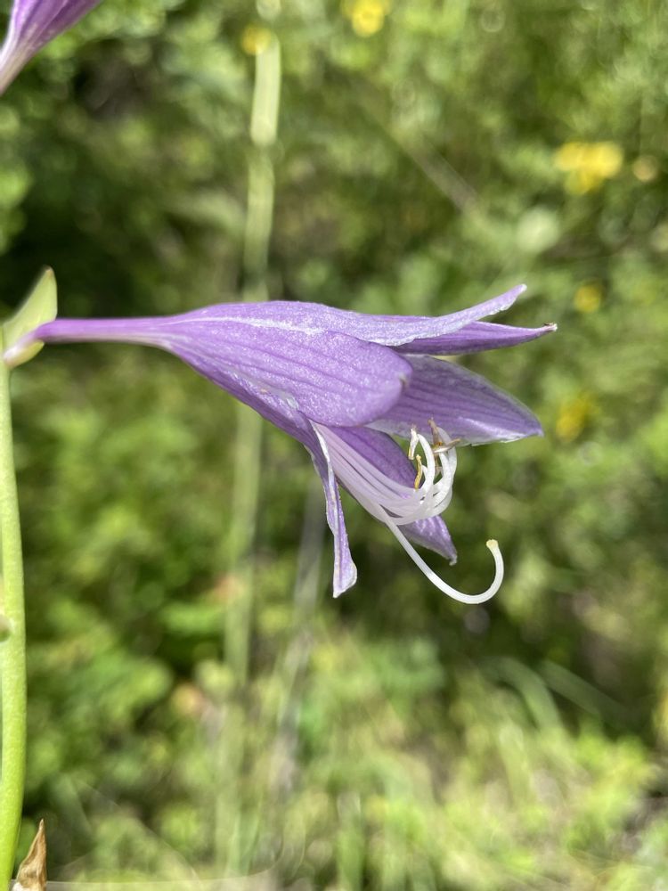 漏斗型の濃い紫色から淡紫色の花をやや下向きにつけ、筒部に透明な線が入る。