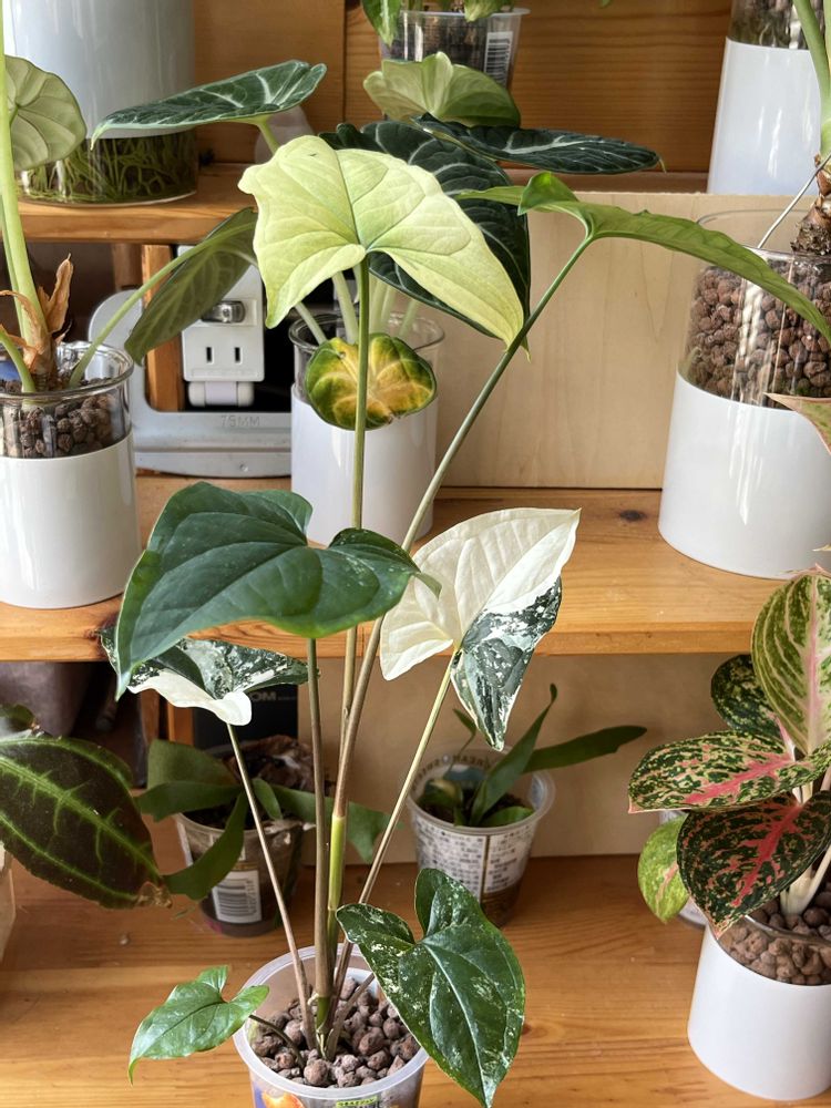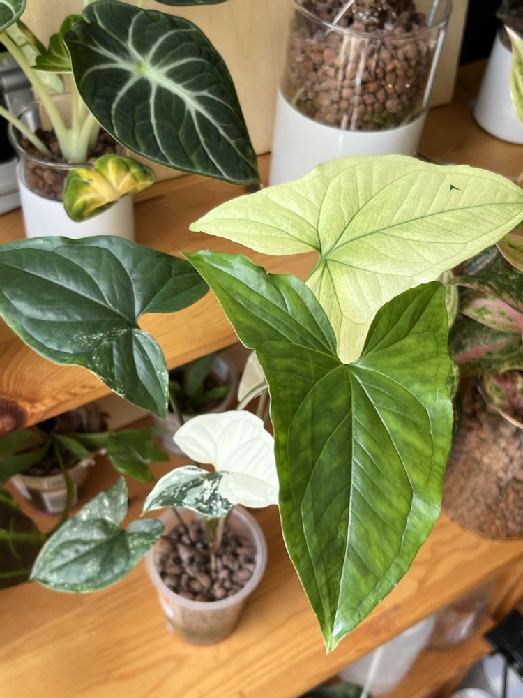 2025.8月に某サイトで購入した【アロカシア チャイ】の 突然変異?なんだろう 購入時、元々有った葉を(1枚目の葉)として、 下から新たな葉が出てきてる状態で到着しました(2枚目の葉) こちらに来て初めて出てきた葉に異変が。。 育て始めて出てきた初めての3枚目、4枚目 (途中から、斑1、斑2、、と続きます) どこまでこの謎の斑入葉が続くのか、 いや止まるのか……記録していきます