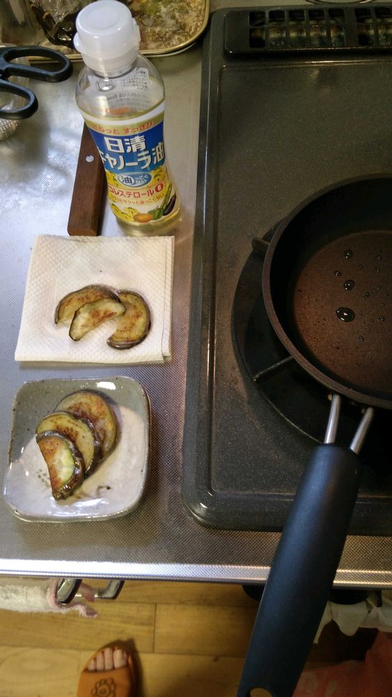 ⑤切って見ると下方は種が多いので上方をスライスしてオイル燒して実食😋