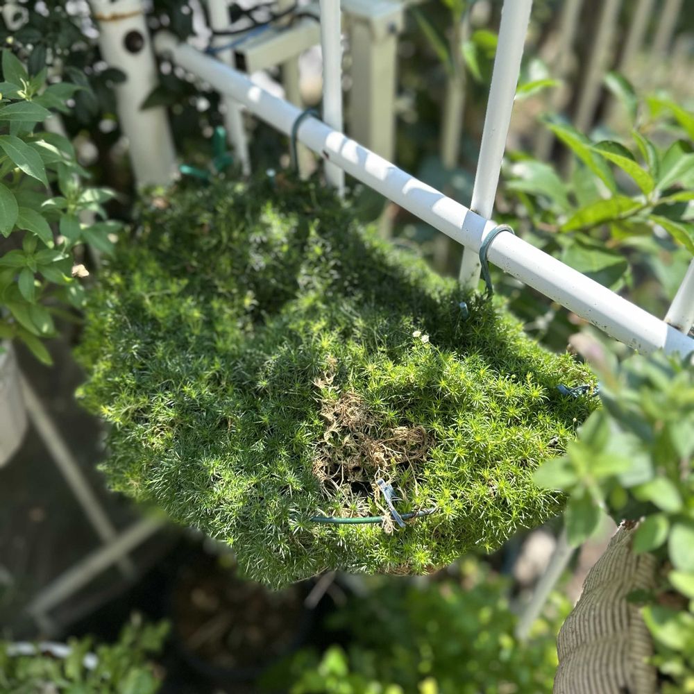 アイリッシュモスがすっかりハンギングバスケットに広がり、小さな小さな小花まで咲いている
