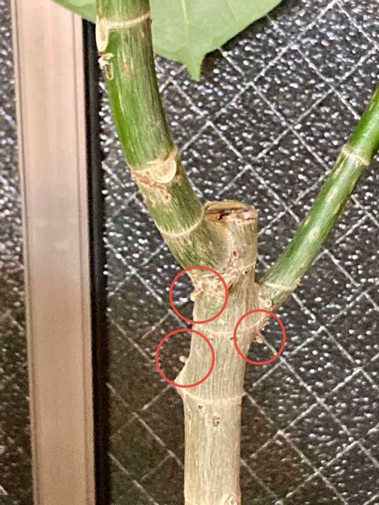 幹の付け根部分と枝分かれの付け根部分に気根と思われる出っ張りが今のところ4ヶ所ほどニョキっと| ‹:)~☆ニョキ