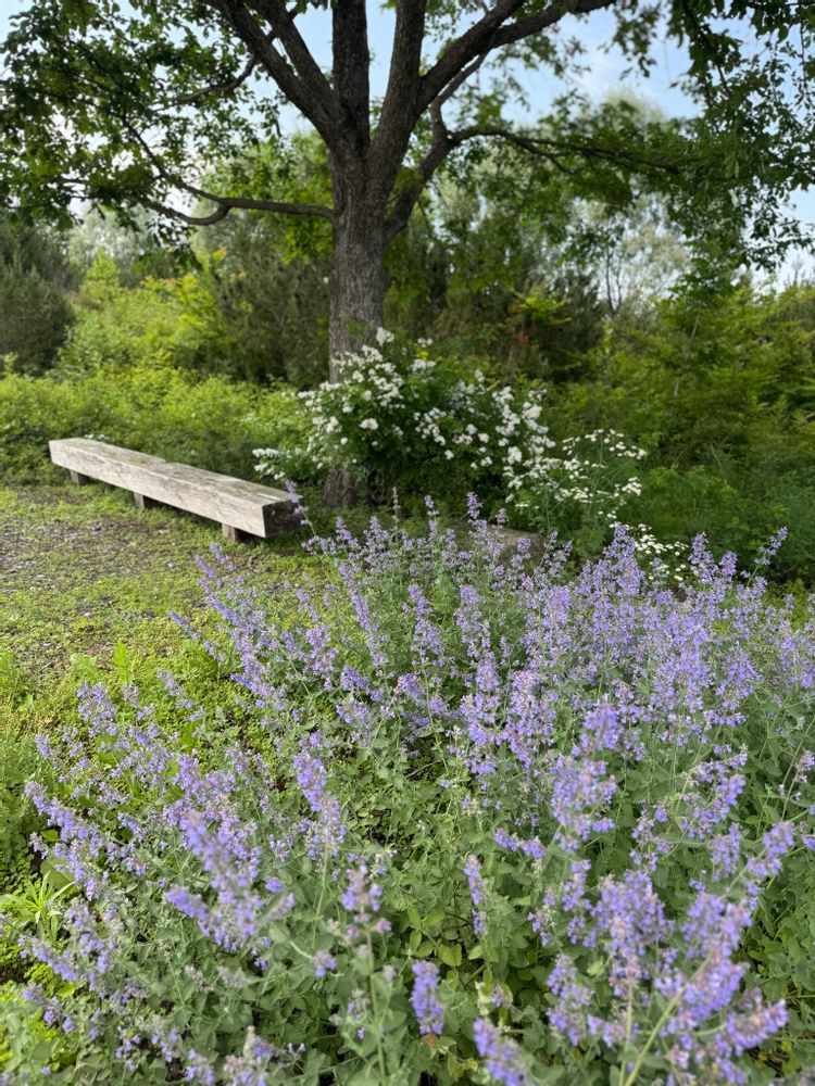 サルビアのお花が咲いている大木の下のベンチ✨🌿