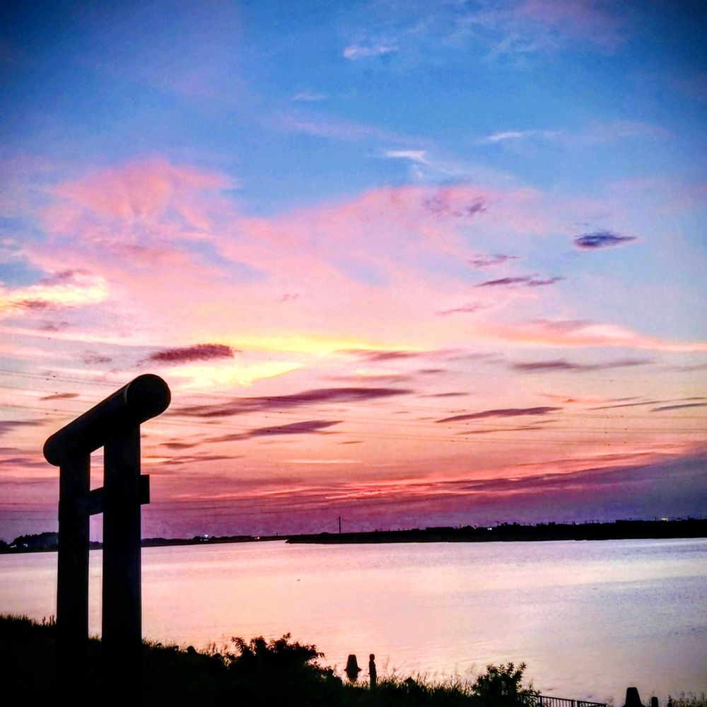 鳥居と川の上の夕焼け 素敵な風景❤ 昼間の猛暑は相変わらずなのに、日の暮れる🌇のはだいぶ早くなりましたね。