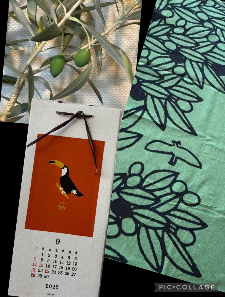 オリーブ🫒色の手拭いにオリーブ🫒と 鳥 暦🗓️も 鳥 百合子さんのオリーブの実🫒
