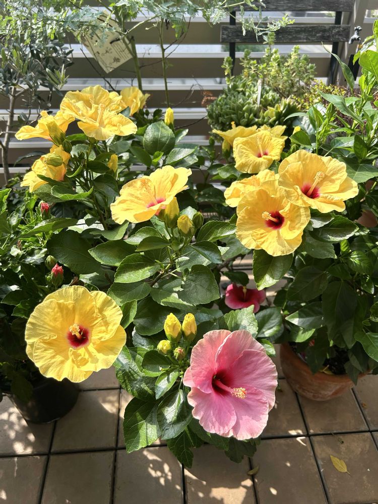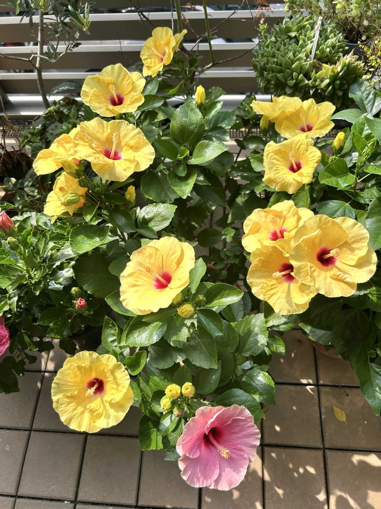 一気にこんなに咲くのは初めてでびっくりです🫢他ハイビスカスは1日で萎むのですが、この黄色だけロングライフシリーズという種類で3日間ぐらい咲いてくれますので、今日もまだ咲いています💛💛💛