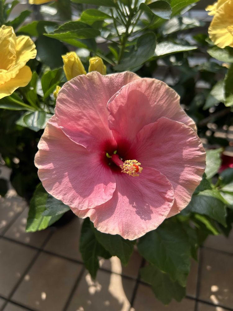 同じ枝先からキメラ咲き?のピンクのハイビスカスが1個🌸