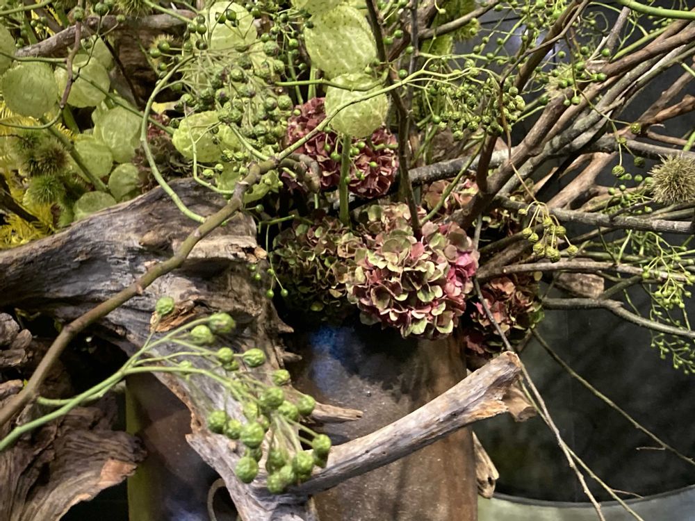 花材:のばら・ふうせんとうわた・栗・秋色あじさい・シダ(緑着色)・雑木・しゃり木