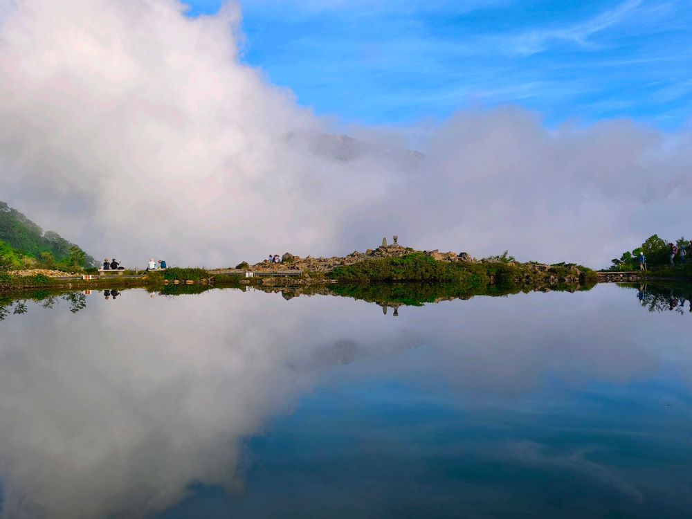 すると40分くらい待っていたら徐々に雲が切れ始め山々が顔を出し始めそれとともに水面に山や雲が映りまるで鏡のように🤩