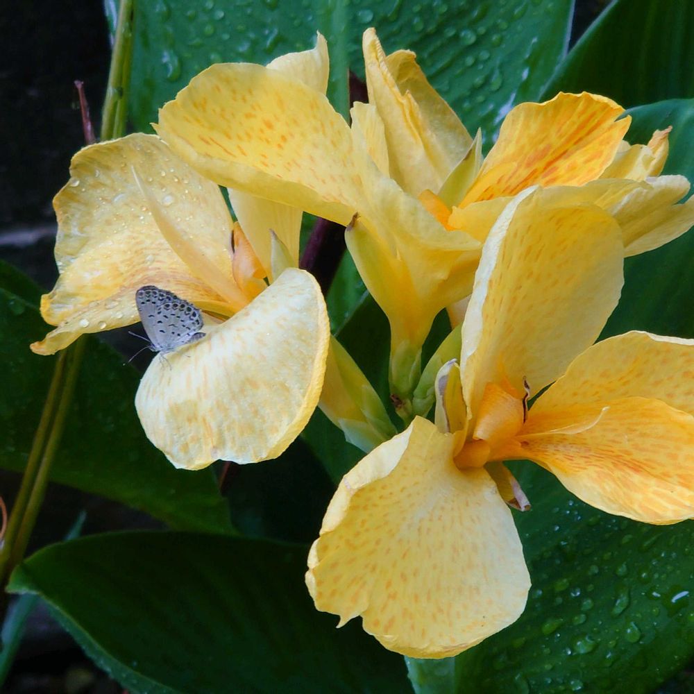 地植えした黄色のカンナに又花が咲始めました〜ビタミンカラーに可愛い小さな🦋発見✨