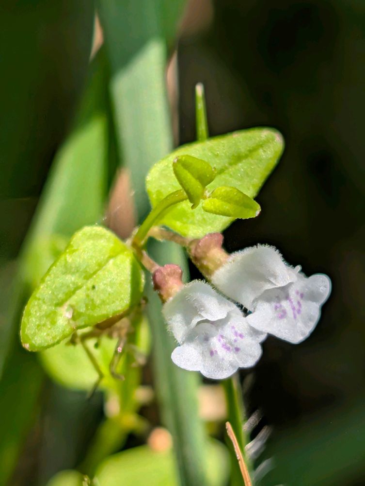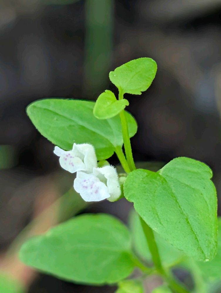 花冠は長さ約7㎜で、下唇に紫色の斑点がある。