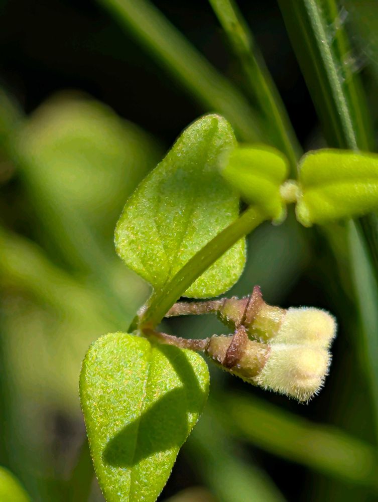 上部の葉腋に、、わずかに淡紫色を帯びた小さな唇形花を1個づつつける。