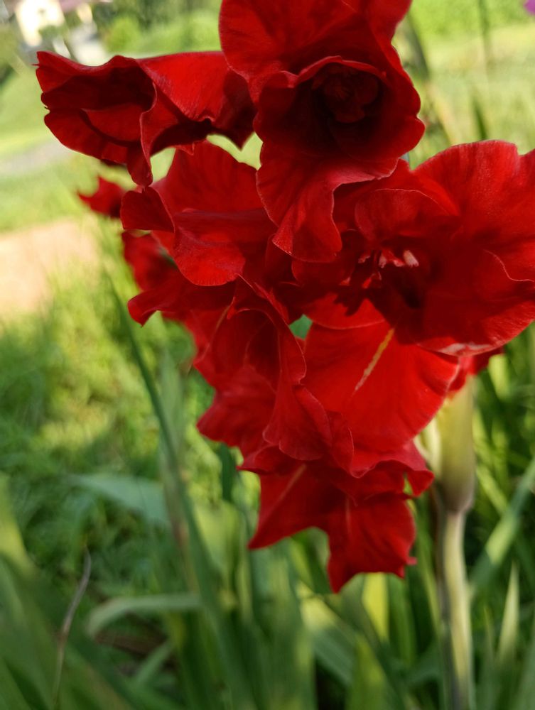 最初の赤いグラジオラスは濃い赤色で黒い斑入りなんですよ😀