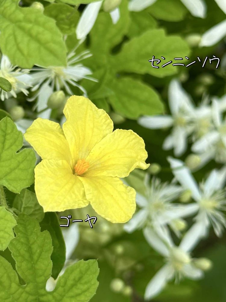 センニンソウとゴーヤが支柱に絡みつき下には今年はじめて咲いたボタンヅル、奥下には青花フジバカマ💜✿˳༚༅༚