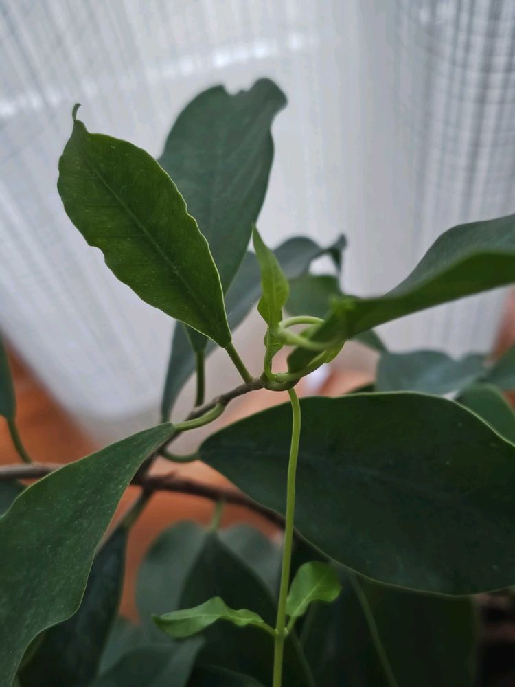触覚の様に2本蔓を伸ばしてガジュマルの葉に巻きついてます