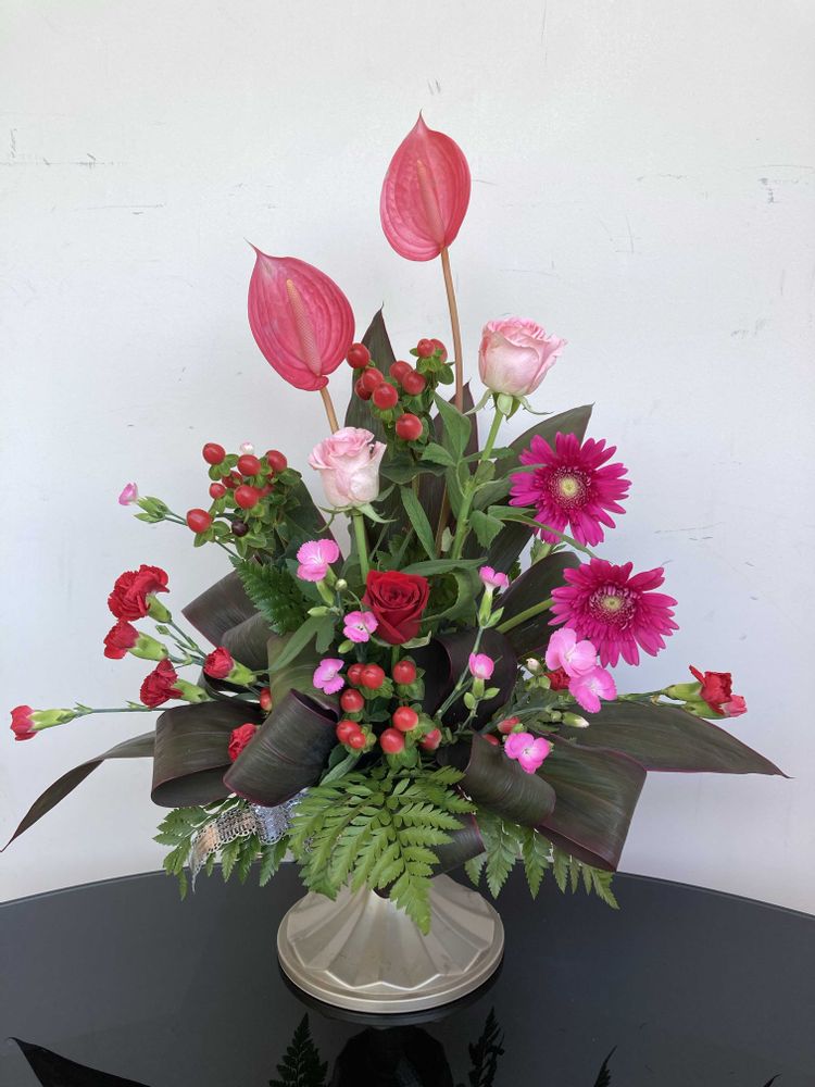 使った花材はアンスリウム、バラ、ガーベラ、カーネーション、ナデシコ、ヒペリカム、ドラセナ、レザーファンです