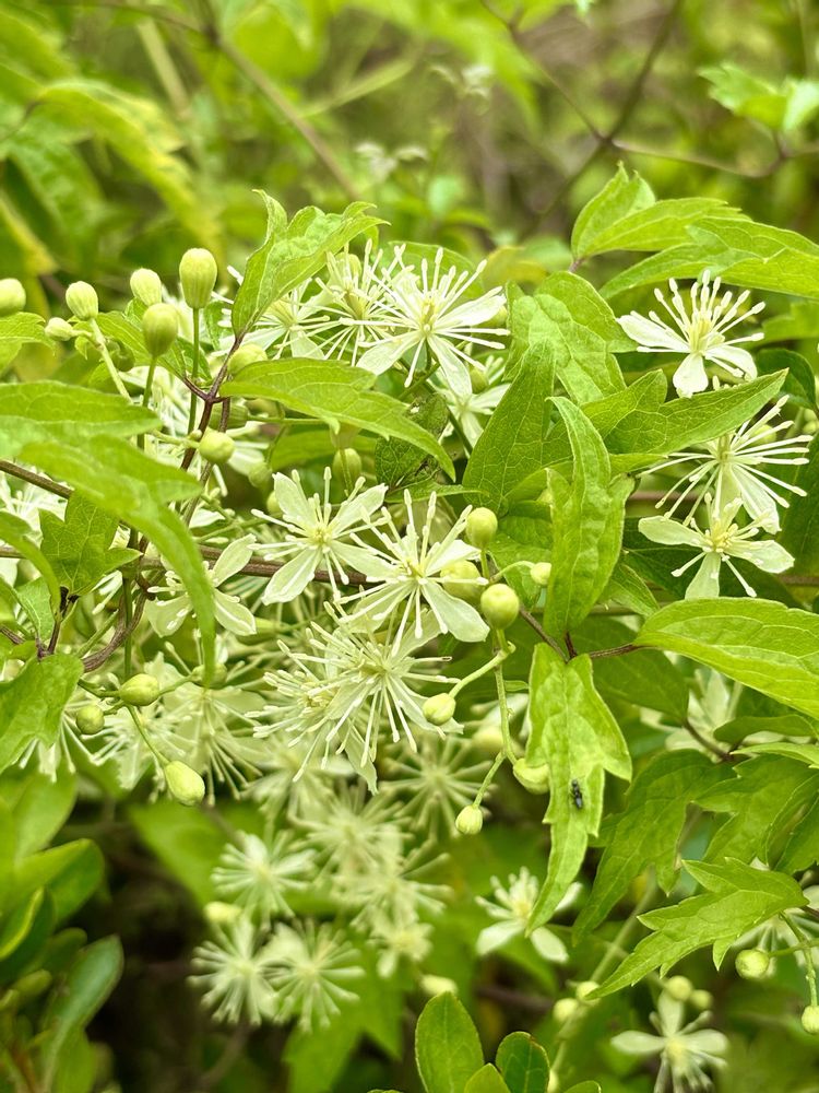 センニンソウによく似ていますが、ボタンヅルの方がお花がひと回り小さくて、真っ白ではなく、淡いクリーム色をしています。