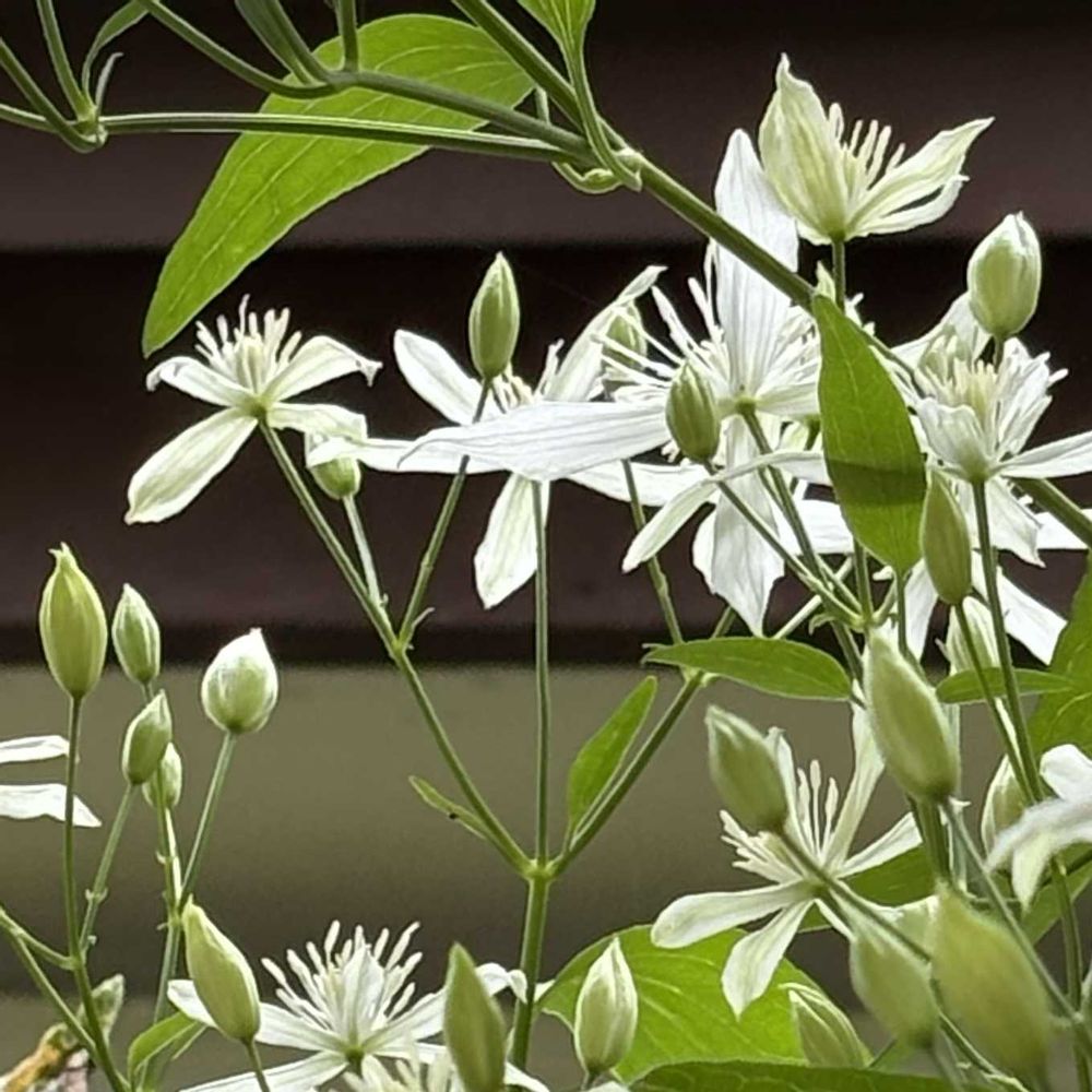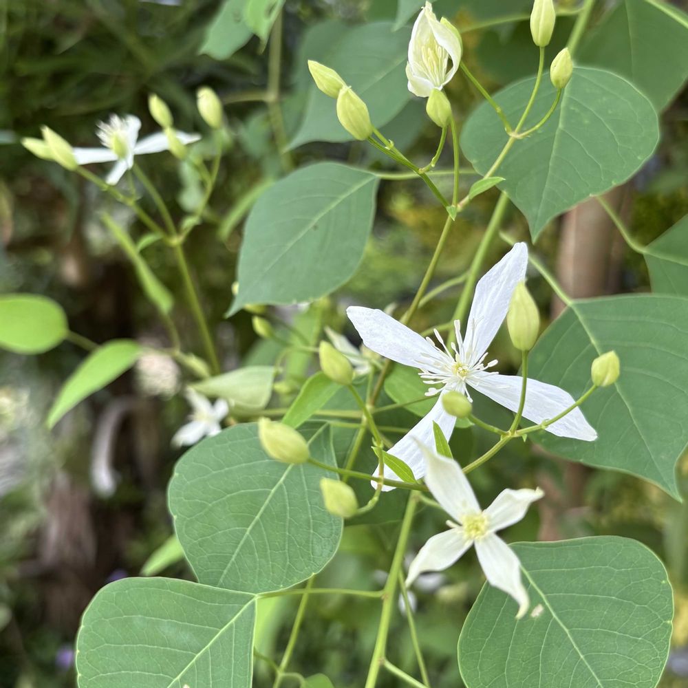 ついに咲きました。╰(*´︶`*)╯♡〜〜。🩷大好きな仙人草。1️⃣2️⃣3️⃣鳥さんからのプレゼント花4️⃣刈られる前にレスキューした鉢植え。3年目につぼみついたー🥰😆🥰😆😆🥰🩷🎶🎶🎶🎶