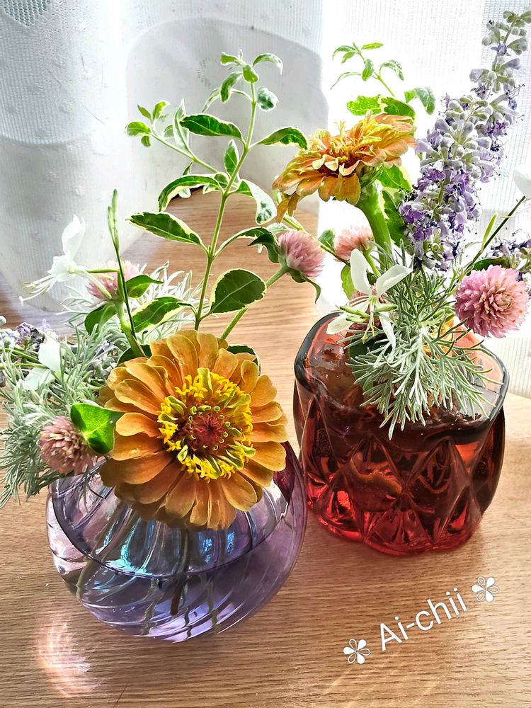 ガラスの花瓶生けのアレンジがふたつとても素敵に仕上がりました💕