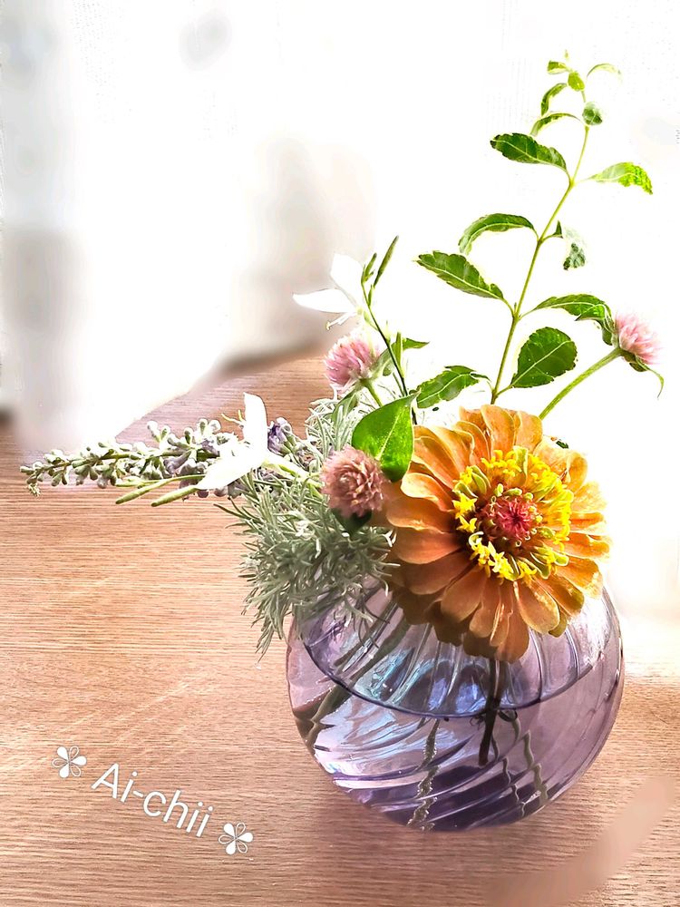 今日のアレンジメントもステキ😍可愛いジニアに、ニンジンボクやアサギリソウが涼しげでいいですね〜👏👏