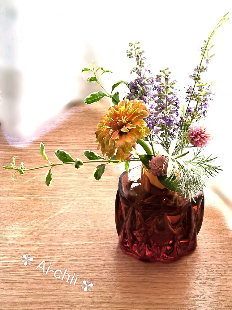 ひとつひとつの花材を吟味して、長さや角度にも拘って楽しんでいけた様子が目に浮かびます。アサギリソウと、蝶のように軽やかなガウラ、がいいアクセントになっています。それぞれに個性がありながら-共有部分もありますね。