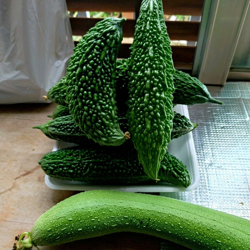 そして今朝の収穫です。ゴーヤーはまだ収穫出来そうです。二袋カットして冷凍保存しました😊