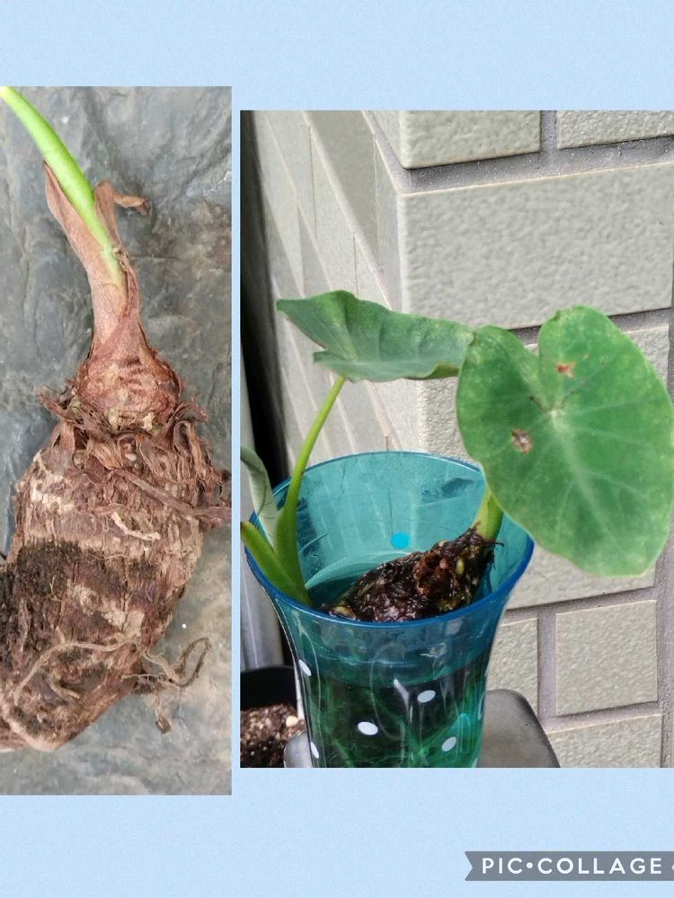 忘れられてた里芋、水に入れてたら葉っぱがニョキニョキ😆
