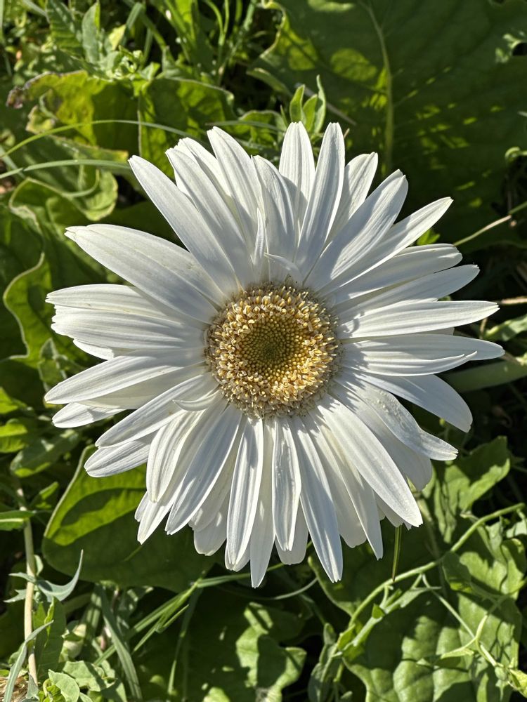 Gerbera jamesonii/Gerbera. Asteraceae. Asterales. Magnoliopshida. Tracheophyta Commonly called/Gerbera Daisy. Transvaal Daisy Native to/South Africa *the tropical and subtropical regions of Africa Symbolism/Happiness. Beauty. Purity *Genus of about 40 species *Large shaped,deeply lobed to pinnatifid leaves,6-18in(15-45cm)long. Flowerheads, 3-5in(8-13cm)across, which has yellow centers. *In ancient Egypt, gerberas were significant for their devotion to the sun and their association with nature. *White gerbea daisies have come to represent innocence and purity. *White gerbera daisies were named in honor of the German botanist and physician Traugott Gerber. These flowers were discovered in Africa in the mid-20th century. Photographed 8/30 8:41am 2025 Posted 9/1(Monday) 12:17pm 2025