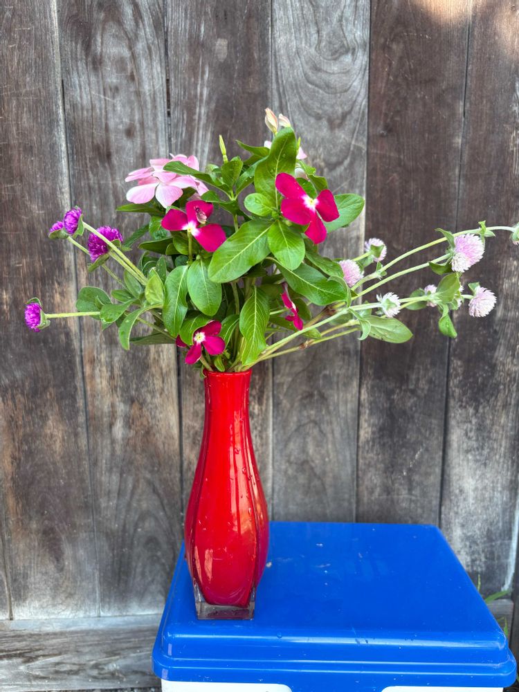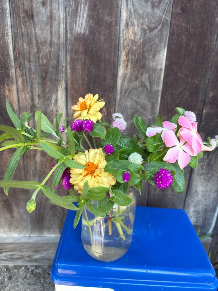 寄せ植えの日々草、ジニア、千日紅もりもりになったので少しすかせるために切りました.可愛いのでちょっといけてみました.