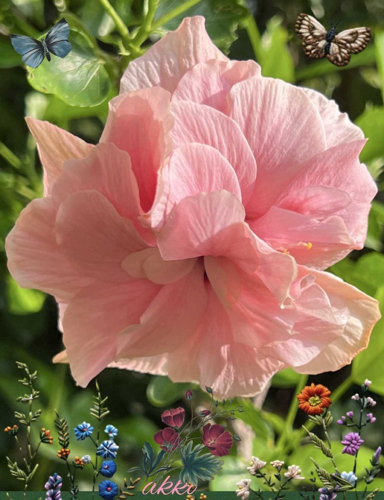 玄関前の八重咲きピンクのハイビスカスが咲き