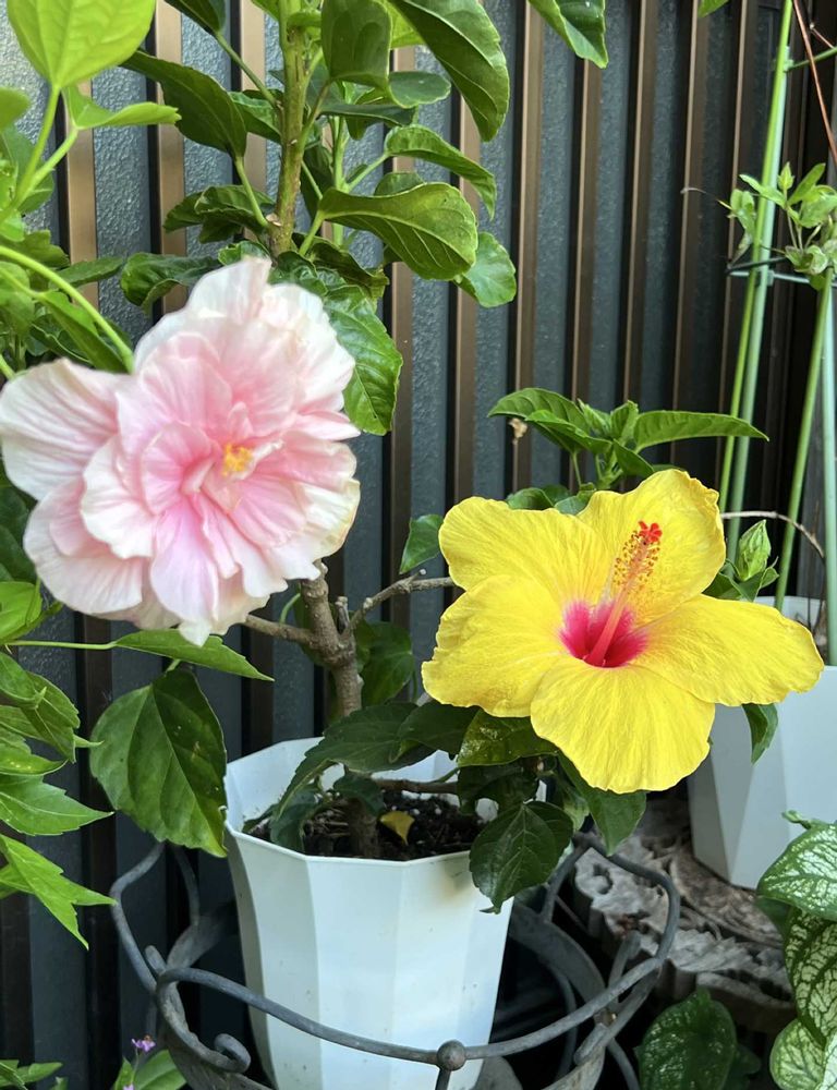 玄関アプローチ,ハイビスカス 一重咲き イエロー,ハイビスカス 八重咲き ピンクの投稿画像