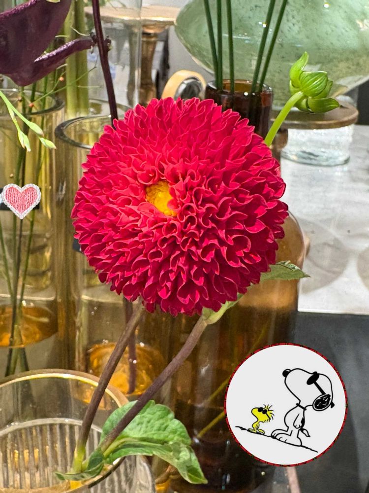 ①太陽のように真っ赤なダリア🌞🔴眩しいとサングラス😎をかけて見ているスヌーピーちゃんたちฅ( 🕶 ฅ)💦