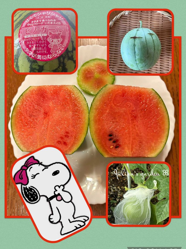 小玉スイカ🍉の名前はピノ・ガールというのですか?種までたべららなんていいですね♪種を取るのが面倒なんですよね。