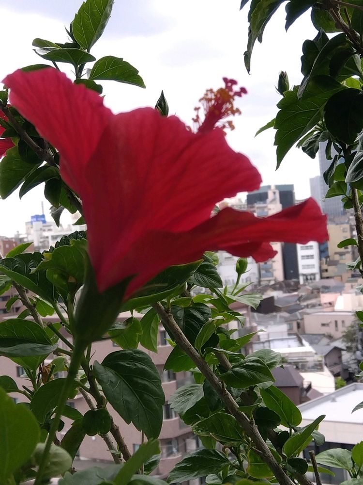 ベランダに咲く赤い花🌺