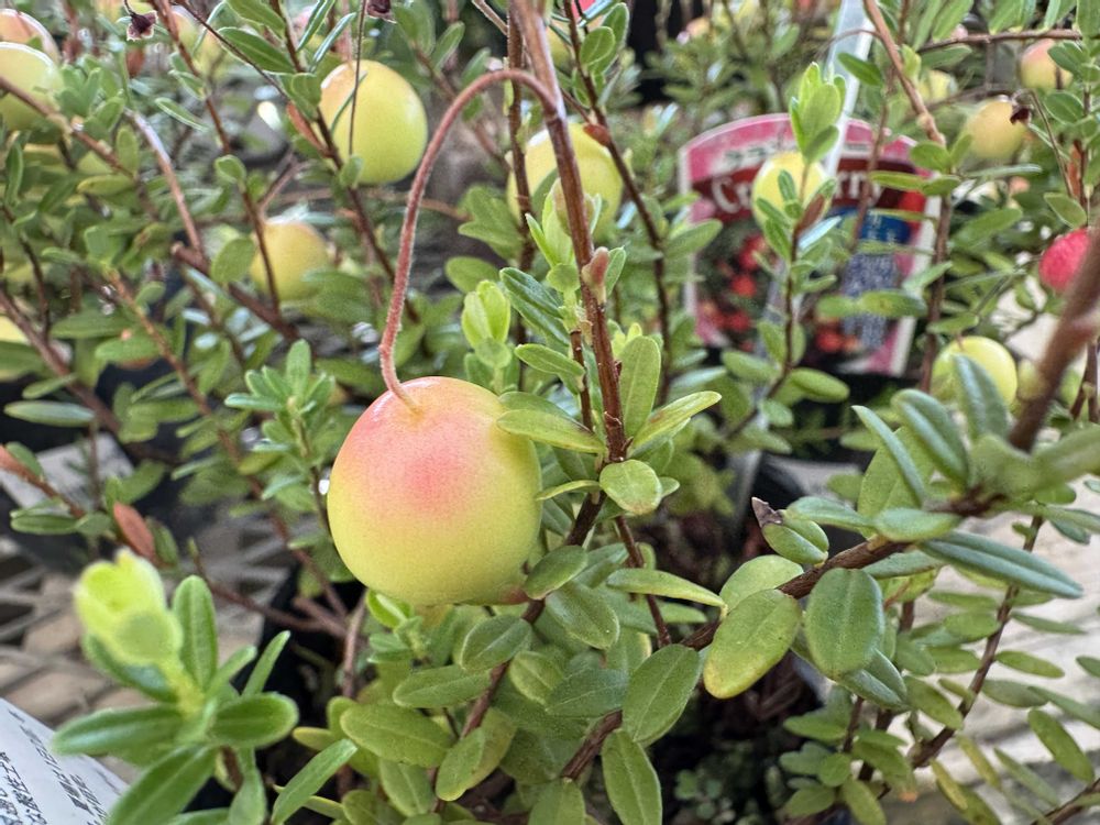クランベリーは、ツツジ科のつる性の果樹で、実のなったかわいい鉢植えが流通しています。一部の会社が米国から数品種導入していますが、一般に流通している鉢物には品種名が表示されていません。冷涼地の果樹で、暖地では成長が悪く、果実も本来の味になりません。したがって、冷涼地以外では観賞の域を出ません。最近、本場の果実が輸入されていますが、それはジャムにしてもよいものができます。