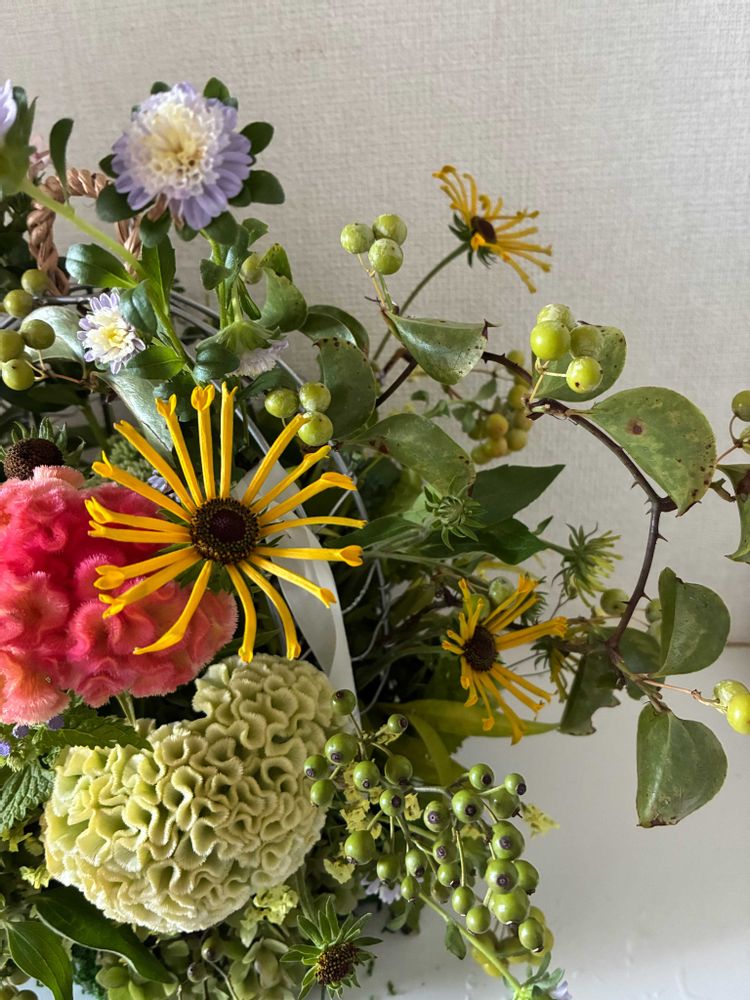 ケイトウの2色の色がアクセントになって、それぞれの花が自由な感じに出来上がりました💐